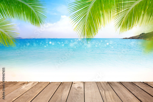 Top Of Wood Table With Blurred Sea And Palm Tree Backgroundconcept